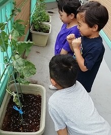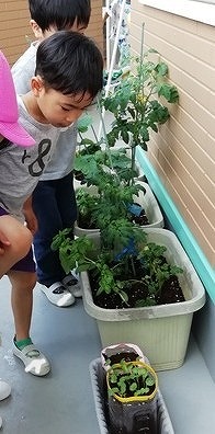 毎日、交代で水をあげ、図鑑とも見比べ、「葉っぱが、ちょっと大きくなったよ!」「花が咲いたよ。もうすぐ実がなるね」「トマトできたー」「チビキュウリがいる」と、皆で話しています。