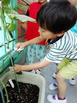 柏鳳保育園では、野菜や花を園庭の菜園やベランダのプランターで育てています。何を育てるか、決めるのは子どもたち。4歳児クラスは今年、クラス名を取って「すみれ組菜園」と名付けました。今、夏野菜が収穫の時期を迎えています。