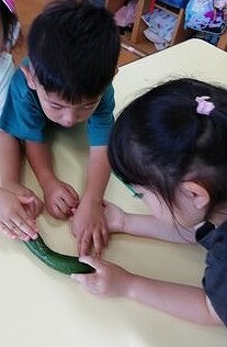 収穫したキュウリとトマトは観察して、絵にも描きました。 「トゲトゲしてる」「キュウリは少し曲がってるよ」「トマトは真っ赤」と、よく見ています。