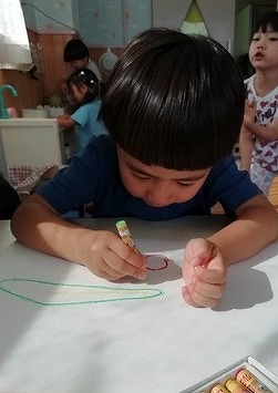 7月は、お気に入りの絵本に出てくるかき氷を作ろうと、山型に切り抜いた白い画用紙にアルミホイルを使ってスタンプを押し、シロップを表現しました。押すたびに、ギュッギュッ、グシャグシャというアルミホイル独特の感触が指先に伝わるのでしょう、不思議そうな顔でアルミホイルを見ていたり…。