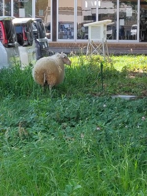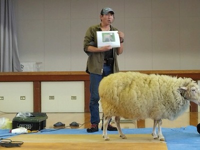 小学校の校庭で、ヒツジが出迎えてくれました。 「あっ、ヒツジがいる」「毛がモコモコしていて暑そうだね」と観察しながら、体育館へ向かいました。