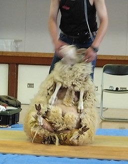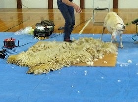 あっという間に、毛を刈り終わりました。毛を広げると、ヒツジの形をした絨毯のようで、初めて見た子ども達は、「すごい」「これでもう暑くないね」「なんか、ヤギみたいになっちゃった」と話していました。