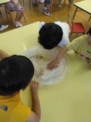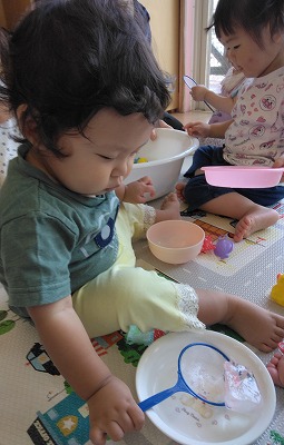 暑さで外に出られない日も、室内でさまざまな活動をしています。そのうちのひとつ、いろいろな素材を使った感触遊びで、最近、0歳、1歳児クラスの子ども達がとても喜んだ、水や氷の遊びをお伝えします。