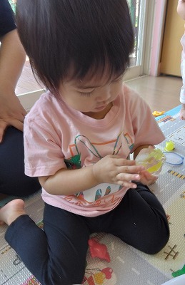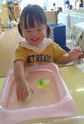 氷に触れてこの笑顔です。でも、すぐにパッと手を離します。「冷たいね」と保育者が言うと、また、触れて笑顔になります。何度も繰り返していました。繰り返すことで、感触、温度、色といった認知、「冷たい」「つるつる」といった言葉がだんだん、しっかりと根づいていきます。