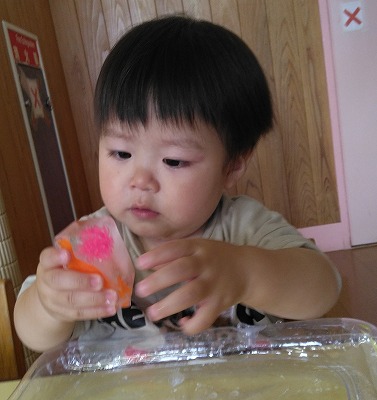 0、1歳児クラスの子ども達は、氷の中にある玩具の端が少しでも出てくるとそれを指でひっぱり、取り出そうとします。取りたい気持ちが最優先の段階です。