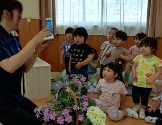 6月は、「あじさいの花を作ろう!」と、手作りスタンプ(乳酸菌飲料の容器の中に絵の具を入れてメラニンスポンジでフタ)を使い、花の模様をつけました。