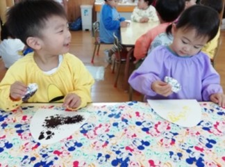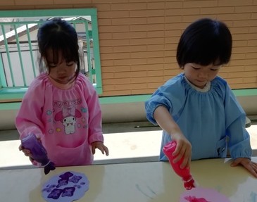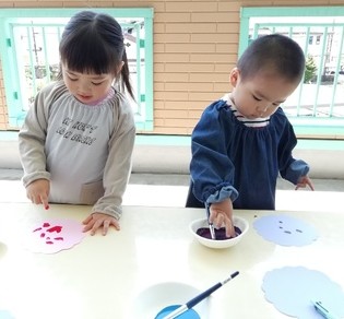 2歳児クラスの子ども達は、指、手の平、筆、スタンプなどを使い、絵の具で遊びます。鮮やかな色づきや模様の変化に夢中です。