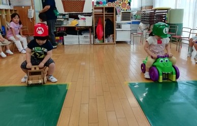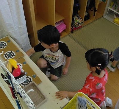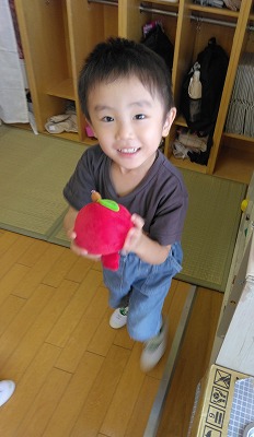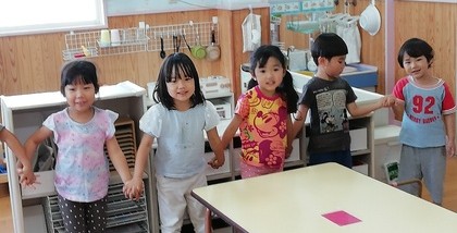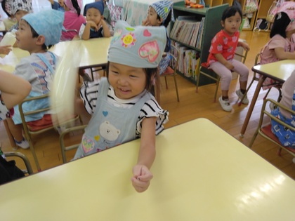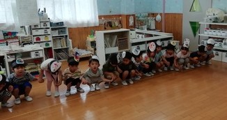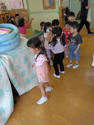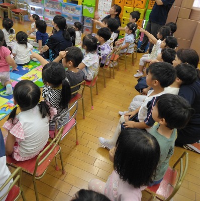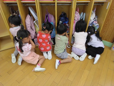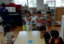 連日の厳しい暑さで戸外遊びはできませんが、子ども達は「かくれんぼしたい〜」「鬼ごっこしたい〜」…。保育者はいろいろ考えて…、人形などを使ったかくれんぼ(宝物探し)をしました。