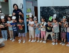 『おばけなんてないさ』を発表することに決めて、歌詞の1番、2番、3番をグループごとに覚え、振付を考えました。そのうち、「おばけになりたいー!」「おばけになって歌おう!」と、おばけの面作りがはじまりました。「どんなおばけにしようか」と相談している子どもたちの会話を聞いていると、「こわい顔にしよう」「魔女のおばけは?」「ドラキュラ!」「ホラーマン!」などなど…。