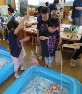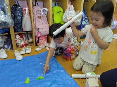 「こっちで魚を釣ってください」、案内された2歳児さんはちょっぴり緊張しながら、一緒に魚釣りをしました。「釣れたら、焼いて食べようね」と言われ、にっこりしながらも、少し戸惑った表情です。