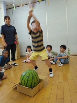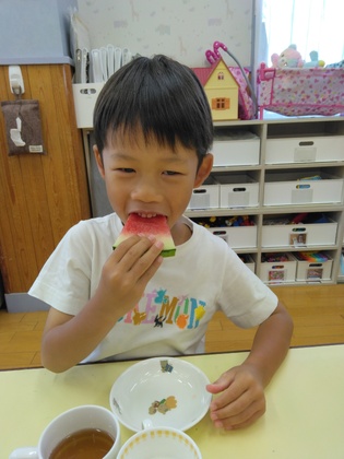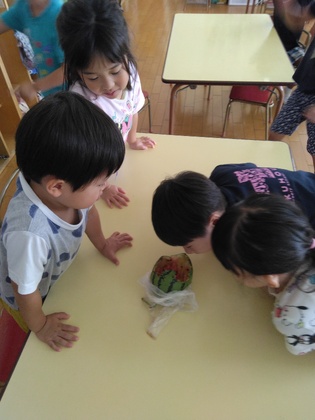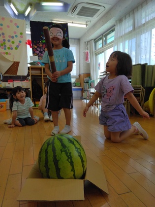 大きなスイカを前に、またまた観察が始まりました。形、模様、大きさ、重さ、そして、「スイカ割りもしたい!」。でも、棒で割ってしまうのはもったいないと思ったのでしょうか、子どもたちは柔らかい棒を使って「割らないスイカ割り」を考え出し、その後、三角に切って皆で食べました。「あまーい!」とうれしそう。