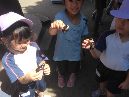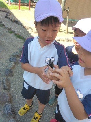 スイカの横でカブトムシを発見しました。「角があるよ」「かっこいい〜」と、大喜びです。