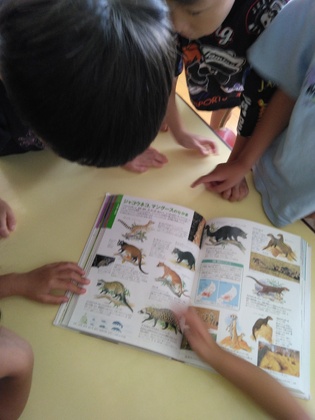 すると…、 スイカの食べられ方から調べて、写真を見せてくれました。「動物によって食べ方が違うんだよ。どれが食べられたスイカに近いかな?」、子ども達が「これ…?」と答えると「そうだね。ハクビシンの食べ方に近い。多分、夜、エサを求めて来たんだと思うよ」。子ども達はハクビシンに興味が湧き、自分たちでも図鑑を広げました。「ハクビシンも甘いスイカを食べられてうれしかったんじゃないかな」「暑いから、水を飲みたかったんだよ」といった声も。