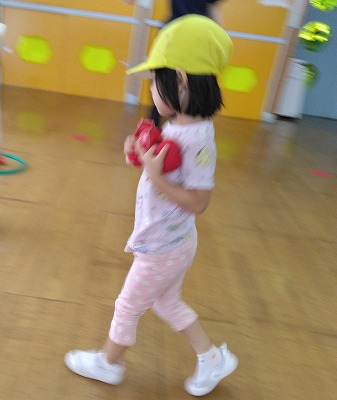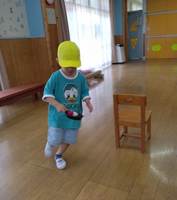 玩具のフライパンやおたまに、ボールやお手玉を乗せて運ぶ競争です。 落ちないように手元をみながら、スピードアップ!! 次の人に渡すときは、「ハイ!」と声をかけて息を合わせていました。