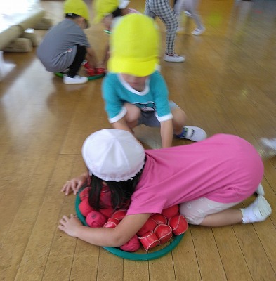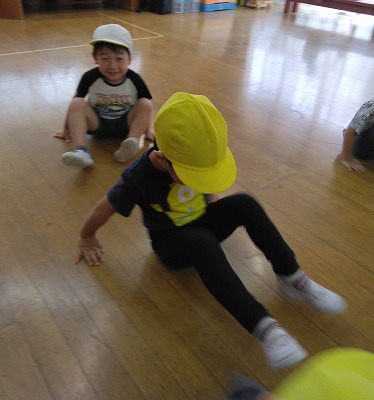 「ぺったんこ鬼ごっこ」です。 お尻をつけて手足で移きます。 鬼につかまらないように皆、必死で逃げています。