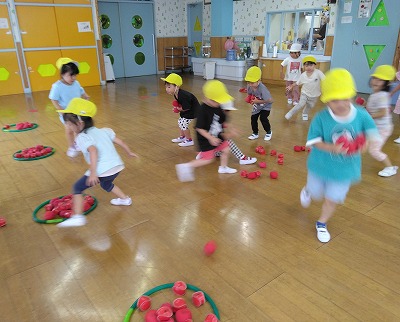 翌日は、自分達の陣地に玉を運ぶ陣取りゲームをしました。 相手の陣地にある玉も自分達の陣地に運んでいいというルールです。 初めは一つずつ運んでいましたが、両手いっぱいに持って一気に運ぶと早いと気づく子どもも。相手チームに取られないよう、自分の陣地を守る姿もみられました。