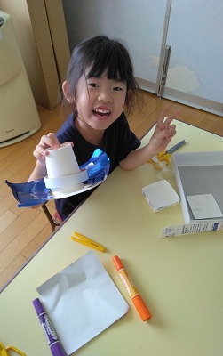 紙コップを使って、ライトやコマも作っていました。