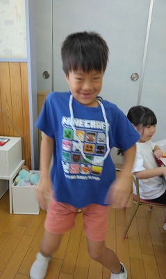 ヒモにストローを通してネックレスを作ったB君がフラダンスのレイを連想したようで、「みんなで、ハワイアン・ダンスをしようよ!」と提案しました。