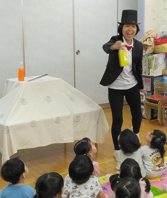 最後の手品では、ペットボトルに入れた水がジュースに変わり…。それだけでは終わりません。麦茶が水(透明)に変化したのです。園見学にいらしていた保護者さんもびっくりしていました。