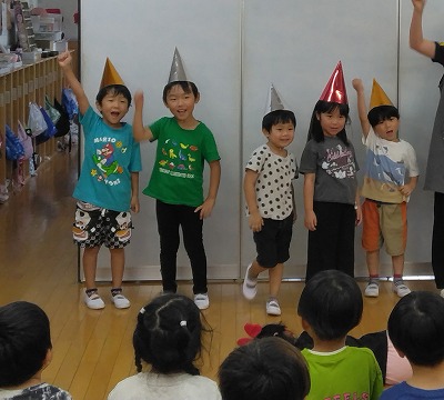 誕生日会の発表が終わると、「ドキドキしたね」と言いながらも、皆で考え、発表できたことに大満足の様子でした。 次は、どんなことをやりたいと言うのか、私たち保育士も楽しみです。