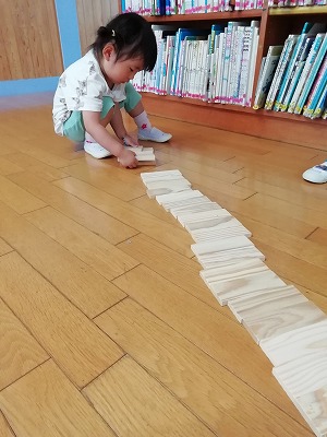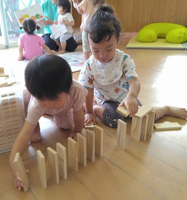 乳児クラスの子ども達は、保育者がしていることを真似るところから始めます。 板をつなげて、広い部屋いっぱいに並べています。長くなっていることを確かめながら、さらにつなげます。立てて並べたり、積み上げたりと遊びが変化していきます。