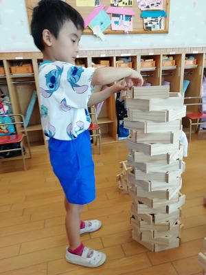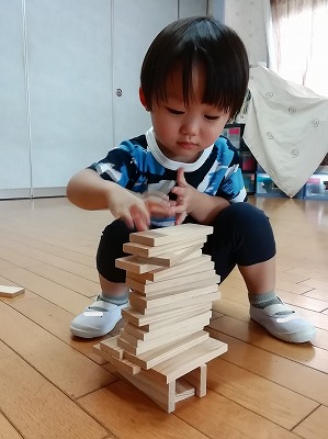 こちらのお子さんは、円柱形に積み上げています。途中で崩れても何度も繰り返し、挑戦していました。崩れる様子も楽しそうに見ています。
