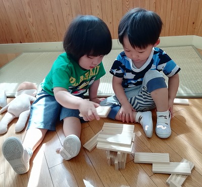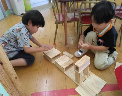 友達と一緒に、長くしたり、積んだり…。何をつくるのか、どんな形にするか、どうしたら倒れないでできるかを考え、慎重に重ねています。