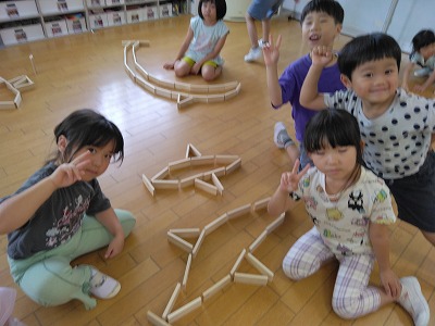 はくほう保育園には、かまぼこの板が3000枚ほどあります。かまぼこの板? お子さん達にとても人気の遊び道具です! 初めは「並べる」「重ねる」ですが、次第に、「見立てて作る」へと変化していきます。つなげてどんどん長くしたり、自分の身長より高く積み上げたり、形に見立てたりして夢中になって遊んでいます。
