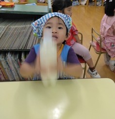 3歳児クラスの子ども達がバター作りをしました。材料は、生クリームとペットボトルの2つだけです!!