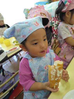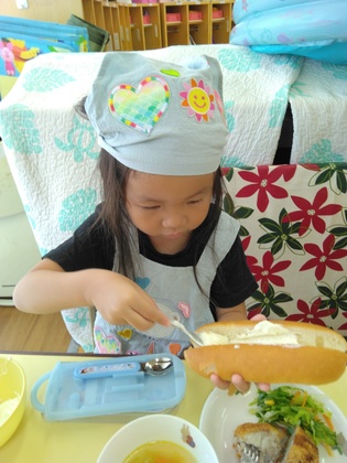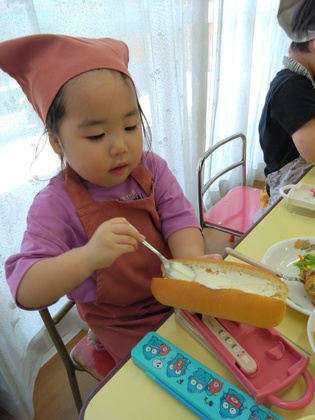 「どんな味がするかな?」「早く食べたい」と、パンに真剣に塗っています。
