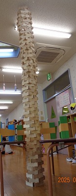 そして、先週のかまぼこ板の続報です。その後…。すごい! 2階のホールで天井に届くまで積みました。最後の最後は、お迎えに来たお父さんが手伝ってくださったそうです。子どもたちは塔が倒れないよう、まわりで活動しています。
