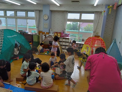 先日、5歳児クラスの子ども達が、「キャンプ(遊び)しよう!」と簡易テントを広げて遊んでいると、2歳児クラスの子ども達がその姿を見て部屋に入ってきました。