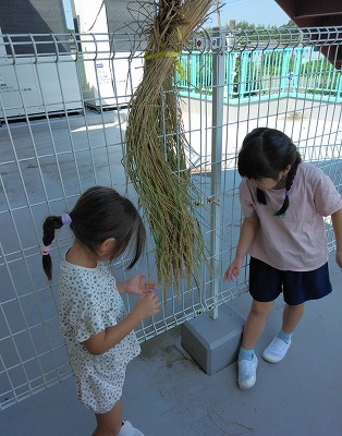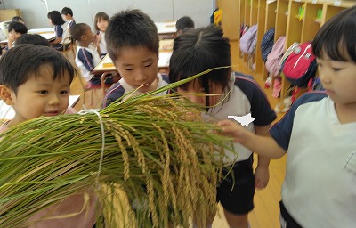 稲に触ったり、匂いを嗅いだりしています。柏鳳保育園のまわりには水田がたくさんありますが、近くで見るのは初めてというお子さんもいました。米とぎで見ていた、白米との違いをよく観察していました。