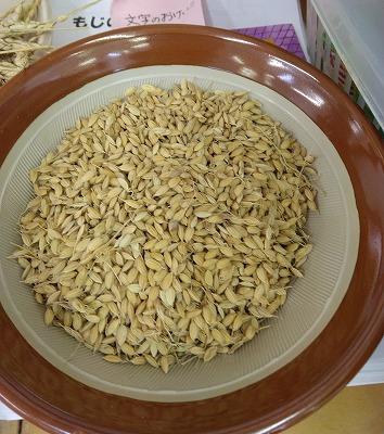 最後は、すり鉢を使って、もみすりです。フーッと息をかけて、もみ殻を飛ばしました。 お米(白米)になる行程を聞き、自分達でも調べ、実際に触れ、道具を使って白米にするという貴重な体験ができました。