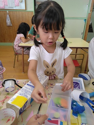 こちらでは、箱にいろいろなものをつけています。 「何かなぁ?」と保育者がのぞくと、ペットボトルのフタをつけたこと、ヒモをつけたことを説明してくれました。つなげて…、くっつけて…。