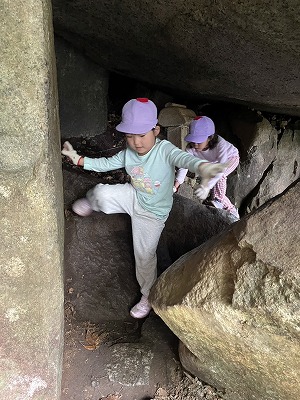 岩場をどんどん登っていきます! 途中、石段を登ったかと思うと、下りがあったり、岩場があったりしました。 その先を進んでいくと、しめ縄がかかった石や小さな鳥居がありました。すると、Aくんが「今日は、ちょっと筑波山におじゃましています。よろしくお願いします」と、手を合わせました。その姿を見て、後から来た子供たちも手を合わせ、感謝と、頂上までたどり着けることを祈っていました。