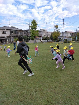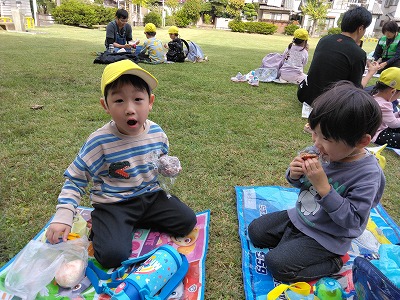3歳児クラスの子ども達は中峠台亀田谷公園へ行き、一面、芝生の広場で、しっぽとりや鬼ごっこをしました。たくさん走った後のおにぎりの味は、最高だったようです。