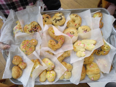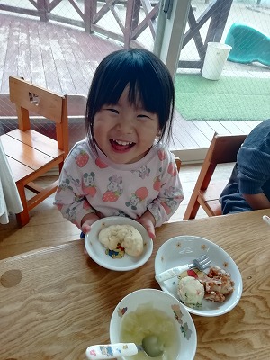 3歳児クラスの子どもたちが調理室へ持っていき、「焼いてください」。「上手にできたね。おいしそう」と調理室の職員に言われると、「ウサギにしたの」「キラキラ、いっぱいのせたよ」と、子どもたちの話が止まりません。