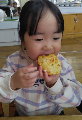 お皿にのせて、この笑顔!! まずパンだけを食べて「おいしい!」。バターをつけて、「おいしい!」。「また、やりたい!!」「今度は、〇〇の形のパンを作る」とあちらこちらから、作りたいパンの話が聞こえてきました。