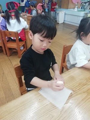 次の日、ふくらんだ生地をみて「大きくなった~」「すごい!」と驚いていました。一人ずつに切り分けて形作りをしました。丸めたり、長細くしたり、思い思いの形にしています。