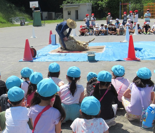 小学校へ向かっている時から、「楽しみだね〜」「早く着かないかな〜」と、ワクワクしながら歩いていましたが、小学校に着き、先生から声をかけられると、一気に緊張の顔つきになった子どもたちです。でも、毛刈りが始まると、「すごい!」と食い入るように見ていました。毛刈り師の工藤さん(羊の毛を刈ってくれる方)が羊をくるりと動かしながら毛を刈っていくと、時々羊が嫌がって足をバタバタさせます。その様子に「もう限界です!って言ってるよ」と表現する子もいました。毛刈りが終わると「ブタみたいになった」「ヤギになった」と、初めて毛のない羊を見た子ども達の感想です。