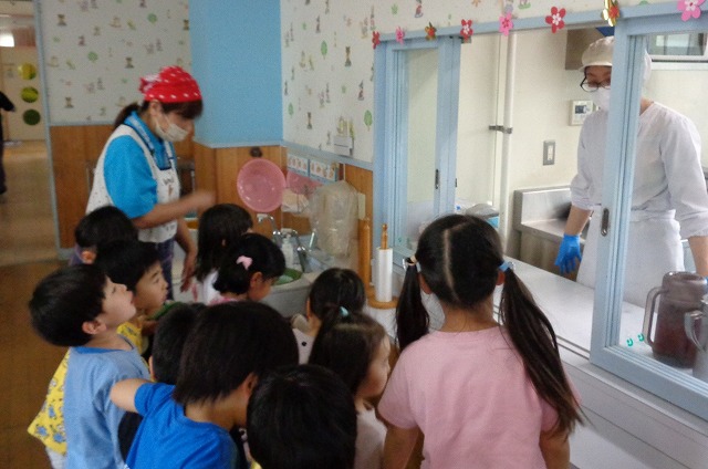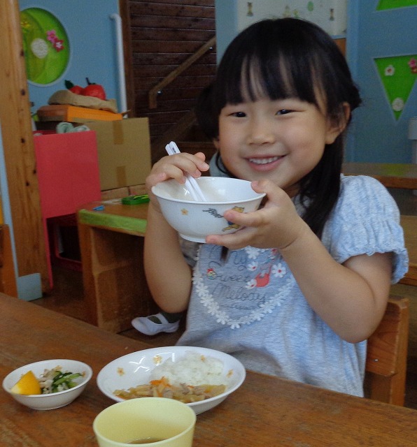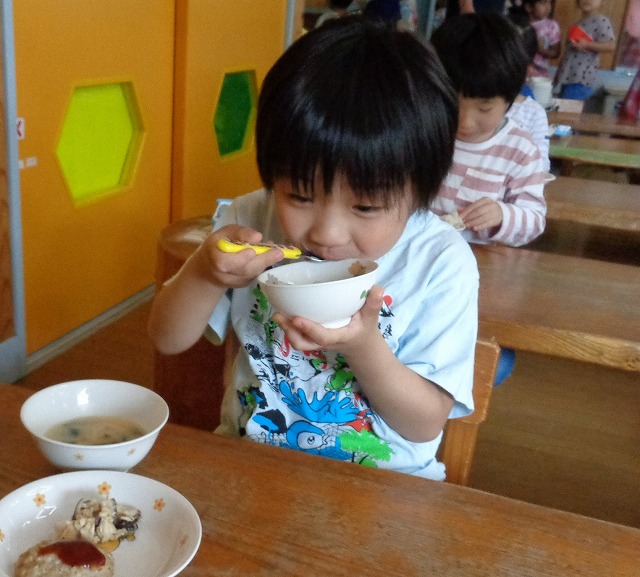 また、免疫力アップの食材として、4月「胚芽米:ビタミン、食物繊維」、5月「きのこ:Bーグルカン」、6月「豚肉:ビタミンB1」をそれぞれ取り入れた内容で提供し、皆たくさん遊んで「お腹すいた〜」と毎日の給食を楽しみにしています。