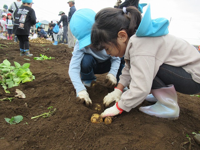 ジャガイモ掘りは、ジャガイモの茎を引っ張ると何個かついてくるので、それで終わりと思っていた子ども達。「土を掘るんだよ」と言われ、掘ってみてびっくり!! 「おおきいのみつけた〜」「これは赤ちゃん芋だ!」と、抱えきれないぐらいのジャガイモが出てきて大喜びでした。「早く食べたいな〜」と楽しみにしていました。