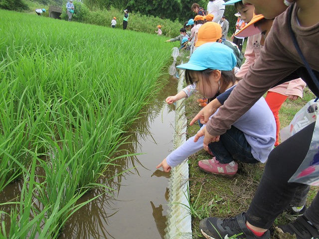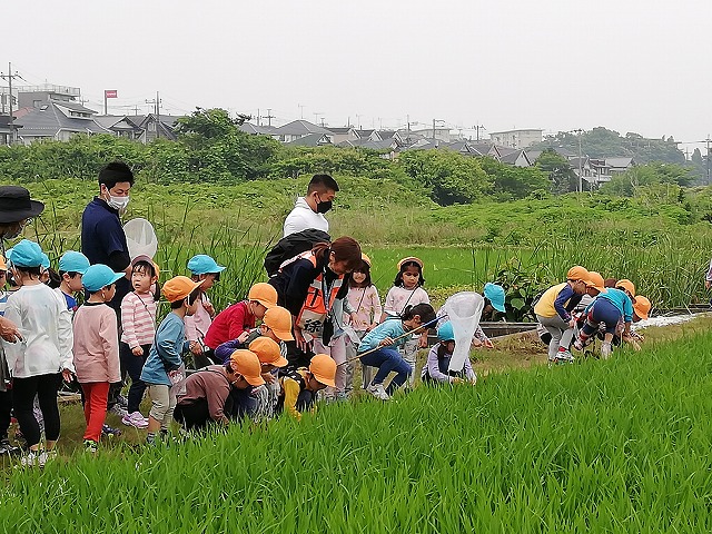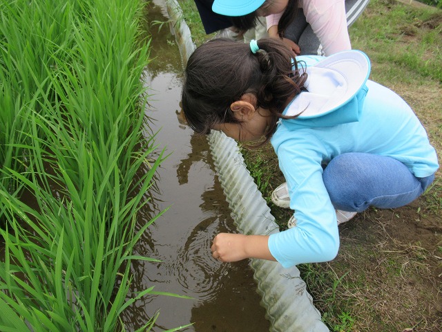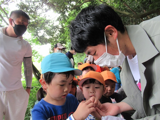 自然に恵まれた場所でチョウやカエルにオタマジャクシ…。たくさんの虫を見つけたり、草で作った船を小川に流したり、「見て見て!」「これなーに!」「見つけた!」「とって!」と大興奮の子ども達。たくさん遊んできました。