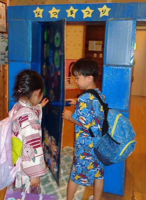 当日、皆を出迎えてくれたのは、ひまわり組が制作した「おまつりのドア」。このドアをくぐると、保育園全体がみんなの飾りで夏まつり会場に!! 夏まつり会場にいざなう扉だそうです。