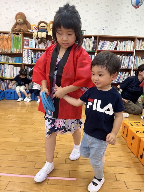 「的あて」と「輪投げ」を行うゲームコーナーは、ひまわり組の担当です。「みんな、こっちに並ぶんだよ」「ボール、どうぞ」と、ゲームコーナーはおとな要らず。小さいクラスの子どもたちも夏まつりを楽しみました。