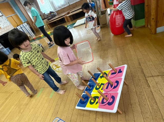 輪投げ:自分たち(5歳児)も交代で体験。「なかなか難しい…」