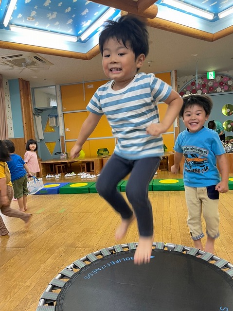 「いろいろな運動遊びを楽しみたい!!」と子ども達が意見を出しあい、「はくほうスポッチャ」の開催が決まりました。ジャンプクッション、トランポリン、パンチングピン、ゴルフ、平均台、鉄棒、ダンス、そして、夏まつりの的当てや輪投げも「もう1回やりたい」という声で追加が決まり、盛りだくさんのコーナーがホールに設定され、皆が思い思いに楽しみました。
