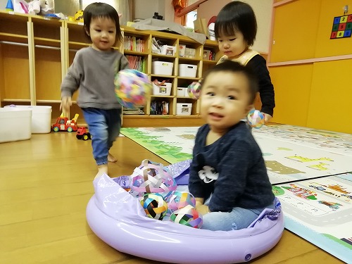 乳児組は、ボールプールを作ったり、大きいボールに小さいボールを詰めたり、引っ張ったりして遊んでいます。