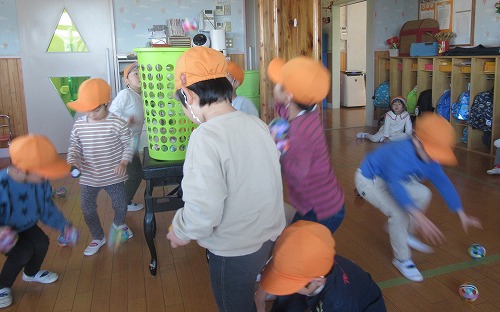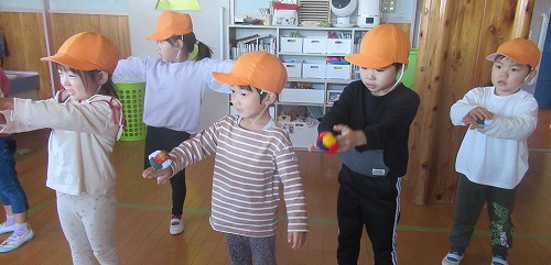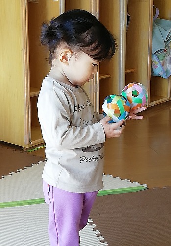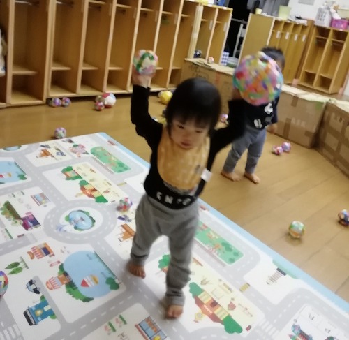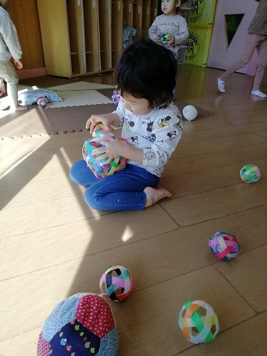 手作りのボールをたくさんいただきました。 幼児組は、体幹遊びに取り入れたり、部屋の中での玉入れをしたり、投げっこ競争をしたりして毎日使っています。